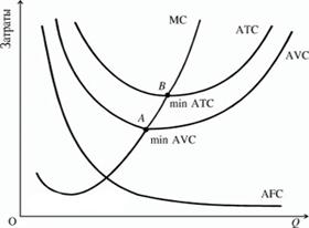 Кривая предельных издержек МС всегда пересекает линии средних общих АТС и средних переменных AVC издержек в точках их минимума, подобно тому, как кривая предельного продукта МР всегда пересекает кривую среднего продукта АP в точке его максимума.