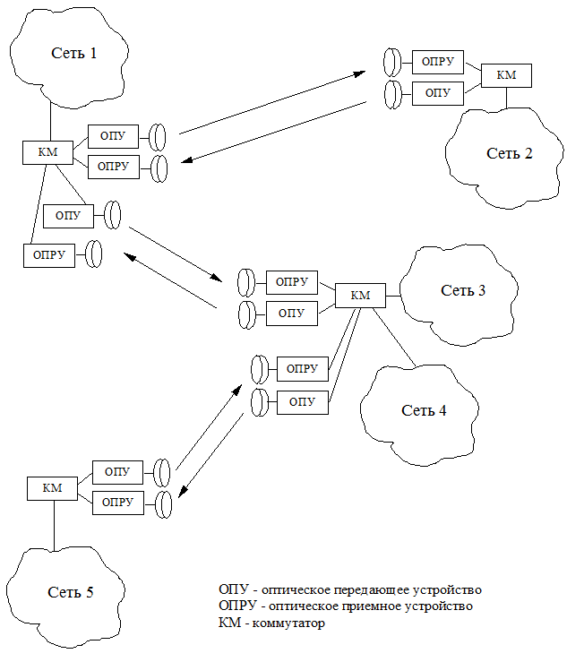 Каждая ячейка сети на основе электрических кабелей (как правило это витая пара), через коммутатор КМ подсоединяется к cистеме оптического доступа. ООСД состоит из оптических передающего (ОПУ) и приемного (ОПРУ) устройств с оптическими антеннами, обеспечивающими концентрацию оптического излучения в заданном направлении.