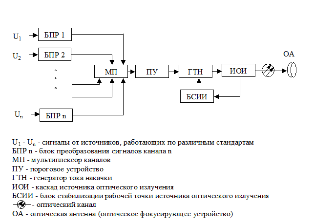 Оптическое передающее устройство с мультиплексором каналов в радиодиапазоне (рис.1.2) предназначено для передачи n - сигналов от источников, работающих по различным стандартам, например от телефона, факса, цифровой АТС, локальной компьютерной сети, станции приема телевизионных каналов.