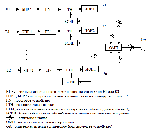 В отличие от схемы (рис.1.2) в каждом канале используется источник оптического излучения со своей рабочей длиной волны λi. Сигналы с различными оптическими несущими подаются на оптический мультиплексор, объединяющий оптические каналы по методу СРК, упоминавшемуся выше.