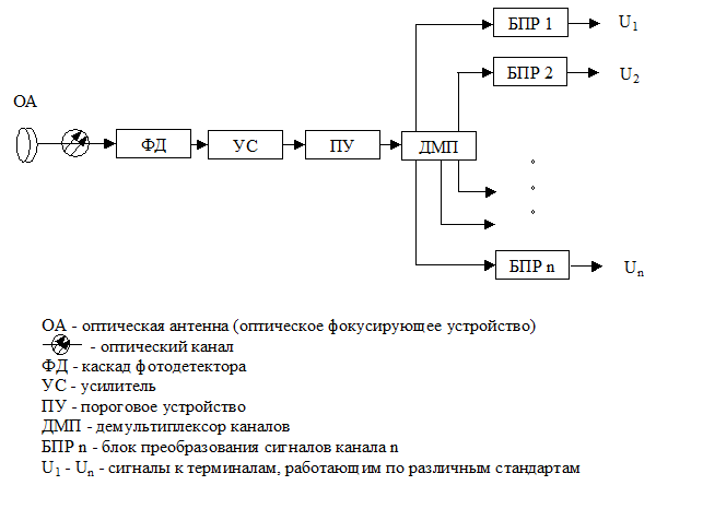 Двум схемам оптических передающих устройств соответствуют две схемы оптических приемных устройств (ОПРУ): с мультиплексором в радиодиапазоне (рис.1.4) и с оптическим мультиплексором (рис.1.5).