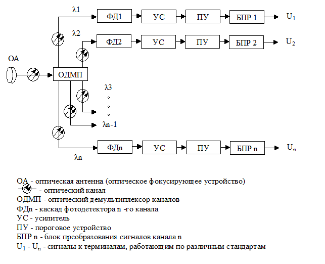 Рисунок 1.5 - Структурная схема оптического приемного устройства с оптическим мультиплексором