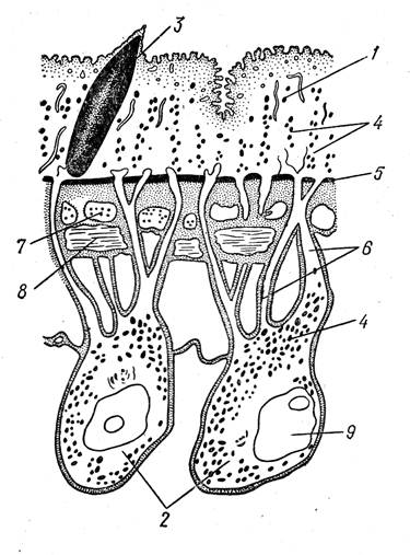 1 – наружный слой тегумента, 2 – погруженные участки цитоплазмы с ядрами, 3 – кутикулярный шипик, 4 – митохондрии, 5 – базальная мембрана, 6 – цитоплазматические тяжи, соединяющие наружную и погруженную части тегумента, 7 – кольцевые мышцы,, 8 – продольные мышцы, 9 – ядра тегумента