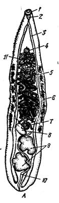 1 – ротовая присоска, 2 – глотка, 3 – кишечник, 4 – брюшная присоска, 5 – матка, 6 – желточники, 7 – яичник, 8 – семеприемник, 9 – семенники, 10 – мочевой пузырь, 11 – семяизвергательный канал