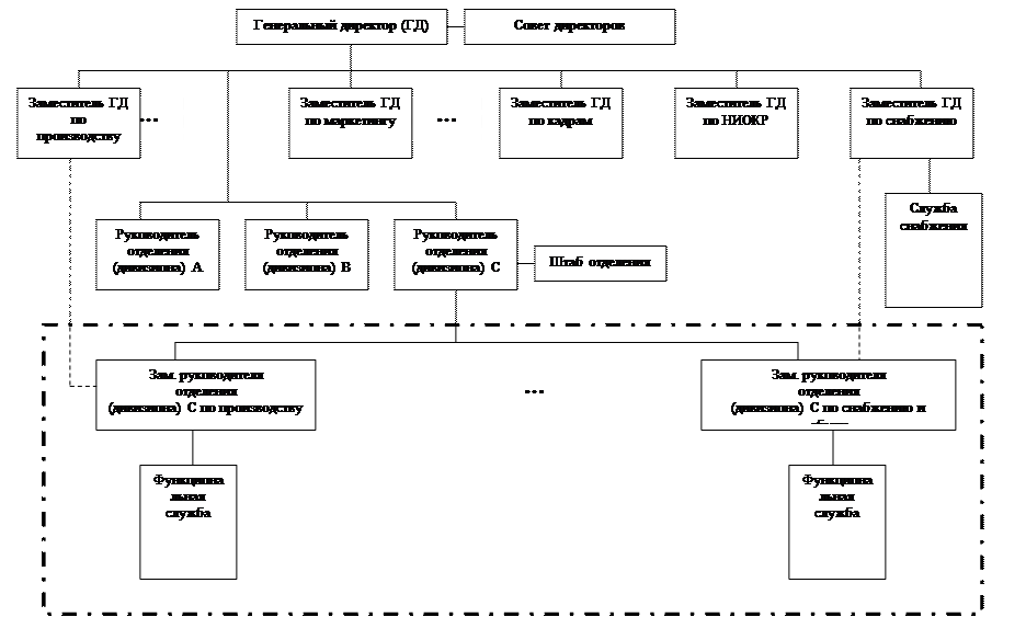 основные связи — вертикальные, поэтому остаются общие для иерархических структур недостатки — волокита, перегруженность управленцев, плохое взаимодействие при решении вопросов, смежных для подразделений и т. д.;