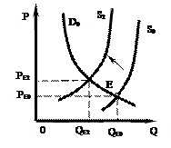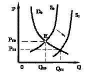 Предоставление субсидий увеличивает предложение. В результате (рис. 4-3) кривая предложения смещается от So к S1, снижается равновесная цена от PЕ0 до PЕ1 и растет равновесный объем производства от QЕ0 к QЕ1.