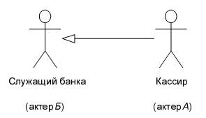 Отношение обобщения между актерами А и В (рисунок 11) отмечает тот факт, что каждый кассир (экземпляр потомка - актера А) является одновременно служащим банка (экземпляром предка - актера В). Актер А (кассир) обладает всеми свойствами актера В (служащий банка) и может участвовать в связях с теми же вариантами использования, что и актер В (что, кстати подразумевается по умолчанию и никак дополнительно не отображается на UseCase-диаграмме). Однако при этом актер– потомок может быть связан с вариантами использования, не связанными с его предком: например кассир, в отличие от других служащих банка, может быть связан с вариантом использования " Сдача дневной выручки ".