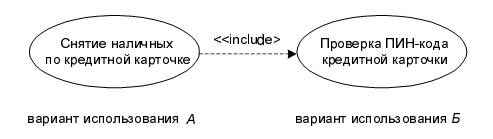 Отношение включения используется в тех случаях, когда в нескольких различных вариантах использования обнаруживаются похожие последовательности действий, которые и выделяются в отдельные варианты использования, включаемые в несколько базовых вариантов.