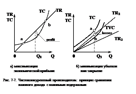 Случай минимизации убытков: TVC < TR < TC. Если валовой доход меньше валовых издержек, но превышает валовые переменные издержки, фирме целесообразно продолжать работу, производя объем производства, при котором экономический убыток (losses) минимален. Отрезок ab (рис. 7-7б) при оптимальном объеме производства Q2 показывает величину экономического убытка. В этом случае валовые переменные издержки (TVC), как и некоторая часть валовых постоянных издержек, могут быть оплачены из валового дохода (TR2). Следовательно, фирма в краткосрочном периоде будет продолжать работать, если ее убыток при работе меньше валовых постоянных издержек.