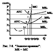 "Золотое правило" - MR = MC, или принцип сопоставления предельного дохода с предельными издержками, основывается на сравнении сумм, которые каждая дополнительная единица продукции будет добавлять к валовому доходу, с одной стороны, и к валовым издержкам - с другой. Любую единицу продукции, предельный доход от которой превышает ее предельные издержки, следует производить, так как на каждой такой единице фирма получит от продажи больше дохода, чем прибавит к издержкам.