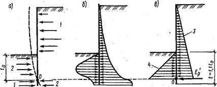 При расчете свободно стоящей стены в грунте принимается, что под действием активного давления грунта она поворачивается относительно неподвижной точки О, расположенной на некоторой глубине t0 ниже дна котлована (рис. 4.1, а). Выше точки О с наружной стороны стены действует пассивное давление грунта, а с внутренней — активное, ниже точки, О - наоборот. Устойчивость стены обеспечивается её равновесным состоянием от действия активного и пассивного давлений грунта.