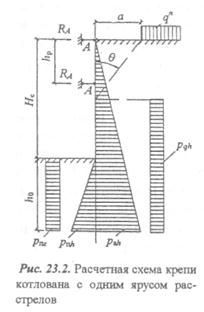 Цель расчета, как и в предыдущем случае, заключается в определении необходимой глубины заложения стены ниже дна котлована, усилий, действующих в стенке и анкерах, а также размеров поперечного сечения стены и анкеров.