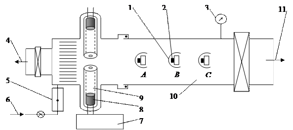 1 - экран; 2 - сетка низкого напряжения; 3 - счетчик давления; 4 - Т.М.Р; 5 - счетчик потока; 6 - газ; 7 - источник подачи энергии на К -ячейку; 8 - металл; 9 - К -ячейка; 10 - трубка стеклянная; 11 - М.В.Р.