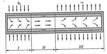 I - зона испарения; II — транспортная зона; III — зона конденсации; qи qK — плотность теплового потока соответственно в зонах испарения и конденсации.