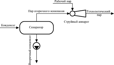 В нем паровой конденсат пара сбрасывается в сепаратор, где кипит за счет расширения. Образующийся при кипении воды пар вторичного вскипания отсасывается из сепаратора пароструйным компрессором. В пароструйном компрессоре происходит процесс смешивания инжектируемого пара с рабочим, в результате из компрессора выходит пар с требуемыми технологическими параметрами. Из сепаратора вторичный конденсат насосом откачивается для дальнейшего использования.