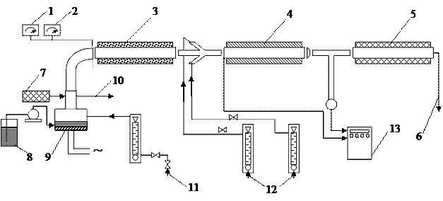 Рис.6.1. Схема установки для пиролиза распылением: 1 - счетчик давления; 2 - счетчик влажности; 3 - сушилка диффузионная; 4 - реактор термолиза; 5 - печь спекания; 6 - сбор порошка наночастиц; 7 - лазерный анализатор размера частиц; 8 – раствор; 9 - распылитель; 10 - в DMPS; 11 – газоноситель; 12 - реакционные газы; 13 - аэрозольный электроанализатор размера частиц.