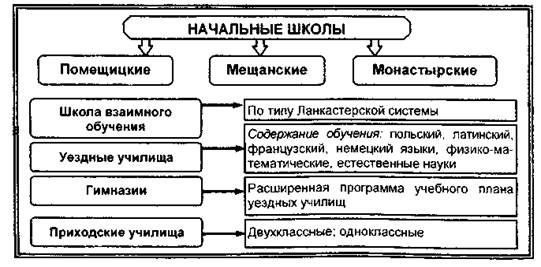 Начальные школы объявлялись открытыми для всех социальных групп. В этих школах предусматривалось «укрепить религиозные и нравственные понятия и дать основу полезного знания». Закон Божий должен был преподавать местный священник или по разрешению церкви специальный учитель. В белорусских губерниях католический священник должен был преподавать Закон Божий ученикам своей конфессии, но на русском языке. Остальные предметы мог вести священник или светский учитель, утвержденный уездным школьным советом. В уездный школьный совет должны были входить представители министерства просвещения, священного синода, других правительственных школьных органов и два члена уездного земского собрания. Уездный школьный совет избирал председателя, которого утверждал губернский школьный совет. Губернский школьный совет состоял из губернатора, главы церковной епархии, губернского руководителя школьного ведомства, двух членов губернского земского собрания. К важным школьным реформам следует отнести разрешение открывать новые частные учебные заведения, учреждение земских гимназий, отмену телесных наказаний в школе.