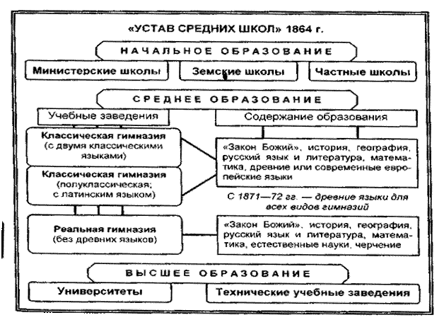 Устав 1864 г. объявлял о создании гимназий классического и современного образования с 7-летним курсом обучения. Были узаконены три типа средней школы: 1) классическая гимназия с двумя древними языками; 2) классическая гимназия с латинским языком; 3) реальная гимназия без древних языков. Учреждался новый тип неполного среднего образования – прогимназия с 4-летним курсом обучения по программам классического и современного образования. Устав утверждал приоритет классицизма. Во всех средних школах должны были изучать Закон Божий, историю, географию, русский язык и литературу, математику. Кроме того, в классических гимназиях предусматривалось преподавание двух древних или современных европейских языков, а в реальных или современных гимназиях – преподавание естественных наук и черчения. Устав 1864 г. коснулся и уездных училищ: предусматривалось преобразовать одну часть уездных училищ в прогимназии, а другую – в 2-летние приходские начальные школы. В 1864 г. был принят устав по начальному образованию. Он предусматривал сосуществование министерских, земских и частных начальных школ. Однако в белорусских губерниях земских и частных школ не было, так как институт земства здесь не вводился и основными были народные училища министерства просвещения и церковноприходские школы, открываемые православной церковью.