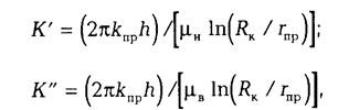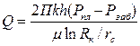 Используя полученное значение коэффициента продуктивности скважины, фильтрационные параметры пласта определяют на основании уравнения Дюпюи, отражающего соотношение между дебитом скв. и перепадом давления при установившейся фильтрации однофазной жидкости к совершенной скважине: