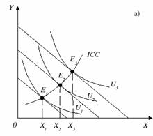 ![]() Рисунок 7.6 - Кривая «доход-потребление» | Все точки, показывающие последовательный рост потребления под влиянием возрастающего реального дохода, будучи соединенными в единую линию, называются кривой «доход-потребление». Английским экономистом Дж. Хиксом эта кривая была названа кривой уровня жизни. Обычно с ростом доходов потребление товаров растет, т.е. кривая «доход-потребление» является восходящей. Изменение цен на товары также смещает точку оптимума потребителя. Кривая «цена-потребление» -это графическая интерпретация последствий частичного снижения цен при неизменных доходах. |