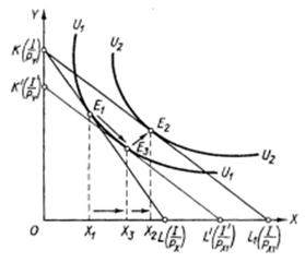 Рассмотрим модель эффекта дохода и эффекта замены по Дж. Хиксу. Пусть исходная бюджетная линия KL имеет точку касания Е 1 с кривой безразличия U1, которой соответствует объем потребления товара Х в количестве Х1 (см. рис. 7.8).