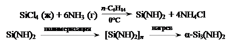 Наноразмерные порошки Si3N4 обычно получают реакцией SiCL4 и NH3 в n -гексане [35]. Первоначальными продуктами этой реакции являются Si(NН)2 – диимид кремния и NH4СI. Смесь продуктов (осадок) нагревали при 360 °С с последующей сублимацией NH4Cl и полимеризацией Si(NH)2. Термический пиролиз полимеризованного Si(NH)4 приводит к получению ультрадисперсных частиц α-Si3N4 по следующей схеме: