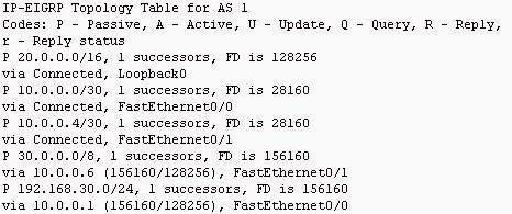 Например для сети 192.168.30.0/24 сообщенная соседом метрика (AD) будет 128256, а метрика которую будет использовать данный маршрутизатор (FD) 156160.