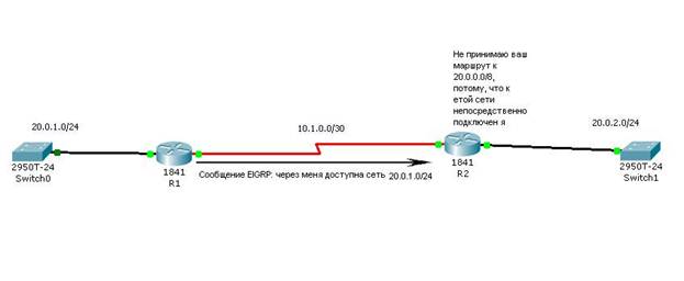 Протокол EIGRP автоматически суммирует маршруты на границе сети, использующей адреса классов.Например маршрутизатор подсоединен только к подсети 10.10.10.0/24, но объявляет, что он подключен ко всей сети класса А – 10.0.0.0/8.В некоторых случаях автосуммирование полезно, это позволяет сделать таблицы маршрутизации максимально компактными.