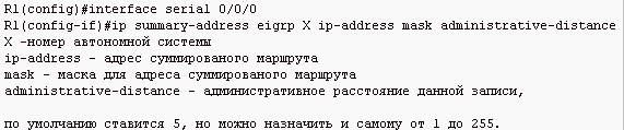 При использовании протокола EIGRP можно самому(вручную) суммировать маршруты. Маршруты суммируются на каждом интерфейсе отдельно! Поэтому нужно выбрать интерфейс, который распространяет информацию о маршрутах. Суммированный(обобщенный) адрес можно объявить с помощью следующих команд: