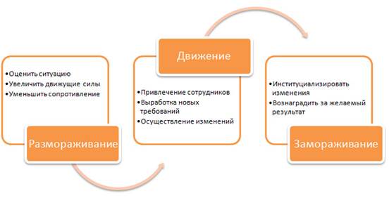 3 Этап: Стадия замораживания представляет собой стабилизацию организации и цементирование нового состояния. Смысл в том, что процесс внедрения нового не всегда является изменением. Ведь очень часто через какое то время после окончания проекта организация отказывается от его результатов, перестает использовать внедрение. Модель К.Левина учитывает такое понятие, как гомеостаз (свойство системы стремиться к восстановлению).