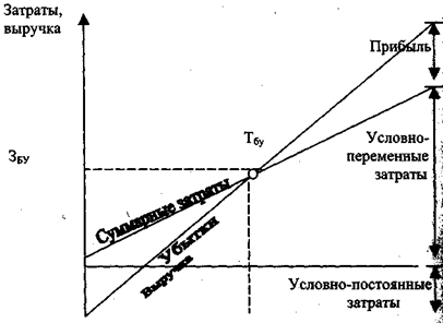Выразительность и лаконичность, универсальность и доходчивость графических схем сделали их наиболее эффективными в аналитической и научно-исследовательской работе. Например, в схеме 11.1 приведен график достижения безубыточности, показывающий влияние на размеры прибыли объемов производства, цены продаж и себестоимости продукции с разбивкой на условно постоянные и условно переменные издержки15. Так, можно найти условную точку безубыточности, т.е. объем производства, при котором кривая изменения выручки реализации (при заданном уровне цен) пересечется с кривой изменения себестоимости продукции. Повышение объемов реализации за этой точкой приведет к появлению прибыли.