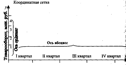 В большинстве случаев в статистических графиках применяется система декартовых координат. На горизонтальной оси абсцисс (ось х) и вертикальной оси ординат (ось у) в определенном порядке располагаются характеристики статистических признаков, а в поле графика размещаются геометрические знаки, составляющие в совокупности сам график.