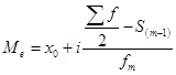Если варианты в ряду распределения заданы в виде интервалов, то первоначально находят медианный интервал, который содержит единицу, находящуюся в середине ранжированного ряда. Для определения этого интервала сумму частот делят пополам и на основе последовательного суммирования частот первого, второго, третьего и т.д. интервалов находят интервал, где расположена медиана. Приближенное значение Ме в медианном интервале исчисляется по формуле:
