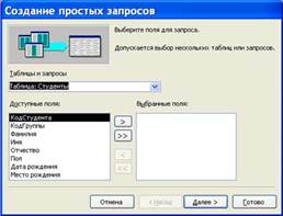 В окне база данных выбрать вкладку Запросы и дважды щелкнуть на пиктограмме Создание query с помощью мастера, появится окно Создание простых запросов.
