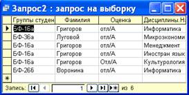 В строке "Условия" отбора и строке "Или" необходимо ввести условия ограниченного поиска – критерии поиска. Например, в поле Оценка ввести - "отл/A", т.е. отображать все фамилии студентов, которые получили оценки отл/A.