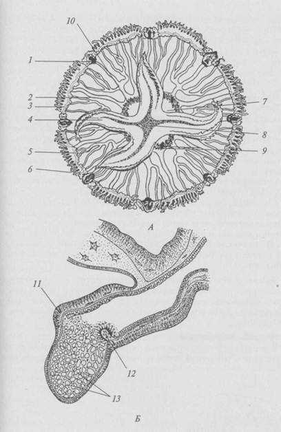 Рисунок 3. Медуза аурелия аурита: А – вид с оральной стороны; Б – продольный разрез через ропалию: 1 – ропалии; 2 – радиальный канал; 3 – кольцевой канал; 4 – ротовая полость; 5 – ветвящийся радиальный канал; 6 –щупальца; 7 – желудок; 7 – желудок; 8 – рот; 9 – гонада; 10 – гастральные нити в карманах желудка; 11 – пигментное пятно; 12 – глазок; 13 – статоцисты