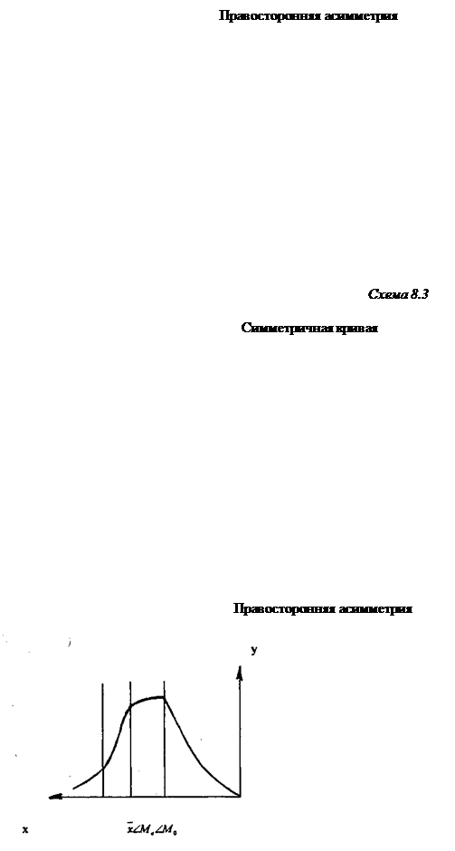 - Ме отрицательные и симметрия левосторонняя (см. схемы 8.2, 8.3, 8.4, в которых показаны соотношения между средней, модой и медианой).