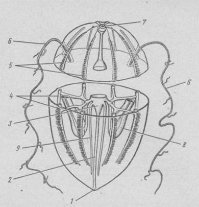 Рисунок 1 – Схема строения гребневика: 1 – ротовое отверстие, 2 – глотка, 3 – желудок, 4 – меридиональные каналы, 5 – ряды гребных пластинок, 6 – щупальца, 7 – аборальный орган, 8 – влагалища щупалец, 9 – каналы, идущие к оральному полюсу