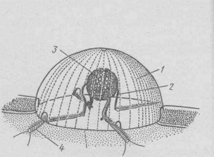Рисунок 3 – Схема строения аборального органа: 1 – колпачок из слившихся ресничек, 2 – дужки, 3 – статолит, 4 – мерцательные бороздки