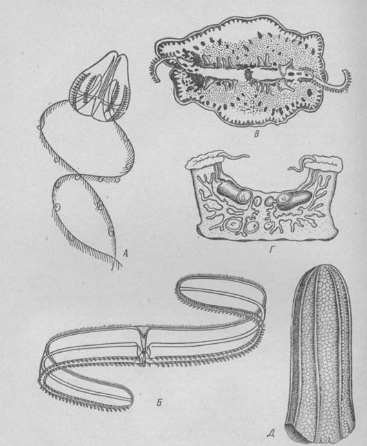 Рисунок 1. Различные представители гребневиков. А — Г — щупальцевые гребневики: А — Cydippe (по Хуну); Б — «Венерин пояс» (Cestus veneris); В — ползающий гребневик Coeloplana; Г — сидячий гребневик Tjal[ielta; Д — бесщупальцевый гребневик Beroe cucumi