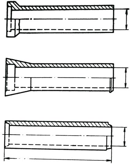 а – продольный разрез крайнего звена чугунной трубы; б – труба из поливинилхлорида; в – полимербетонная труба;