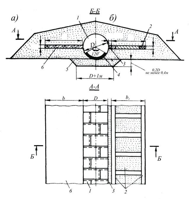1 – труба; 2 – жесткие железобетонные элементы с заполнением из щебня; 3 – заполнение песком; 4 – защитный лоток из асфальтобетона; 5 – гравийно-песчаная подушка; 6 – монолитный бетон