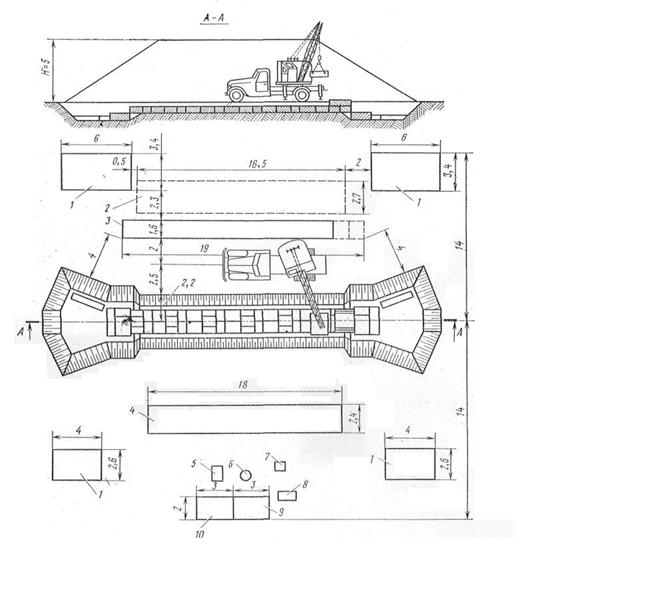 1 – место складирования блоков оголовка; 2 – то же, блоков фундамента; 3 – то же, лекальных блоков, 4 – то же, звеньев; 5 – контейнер с цементом; 6 – бетономешалка; 7 – бак для воды; 8 – электростанция: 9 – песок; 10 – щебень