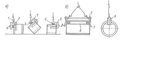 1 – верхняя петля для установки скобы; 2 – скоба; 3 – деревянные подушки для расклинки скобы; 4 – боковая петля для поворота, подъема и установки звена; 5 – траверса; 6 – хомут; 7 – деревянные прокладки