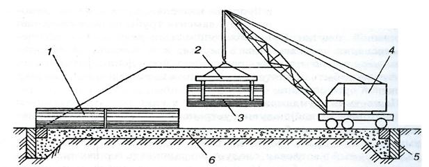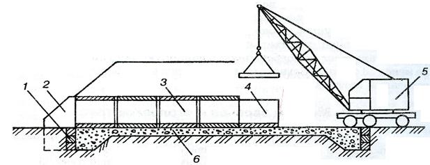 Рис. 19. Схема установки блоков фундамента круглой одноочковой трубы диаметром 1,5 м автомобильным краном