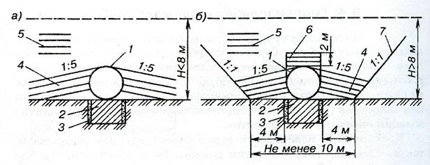 1 – слой грунта засыпки толщиной по 15-20 см; 2 – песчано-гравийная подушка; L = 2D, но не меньше 4 м