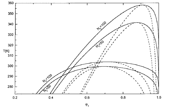 На рис.4 приведены расчетные диаграммы состояния смеси низкомолекулярного (N1=1) и высокомолекулярного компонента с различной степенью полимеризации при