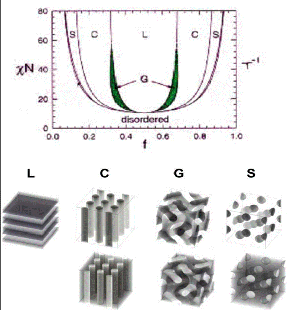 Основным процессом фазового разделения блоксополимеров является не макро-, а микрофазное разделение, или локальное сегрегирование блоков, протекающее по механизму нуклеации или спинодального распада с упорядоченным (периодическим) распределением микрофазных доменов. Положительный вклад энтальпии в свободную энергию в результате уменьшения числа контактов блоков А и В в процессе их локального сегрегирования компенсируется уменьшением энтропии системы в результате локализации узлов соединения блоков на границе раздела фаз и необходимого растяжения цепей от этой границы для обеспечения равномерной плотности их упаковки. Поэтому при повышенной температуре, когда превалирующую роль играет энтропийный фактор, локальное сегрегирование отсутствует. Более низкая температура, при которой энтальпийный фактор становится превалирующим, соответствует температуре упорядоченного микрофазного разделения, или перехода «беспорядок-порядок» c образованием так называемой суперкристаллической (супрамолекулярной) структуры с заданным размером и регулярным расположением структурных элементов (микрофаз в виде тонких пластин, или ламелей, сфер, цилиндров и др.) при неупорядоченной надмолекулярной структурой микрофаз. При этом формирование фазовой морфологии в решающей степени определяется произведением: χN, где N=NA+NB (χкрN=2) и относительной длиной блоков: nА=NA/(NA+NB:
