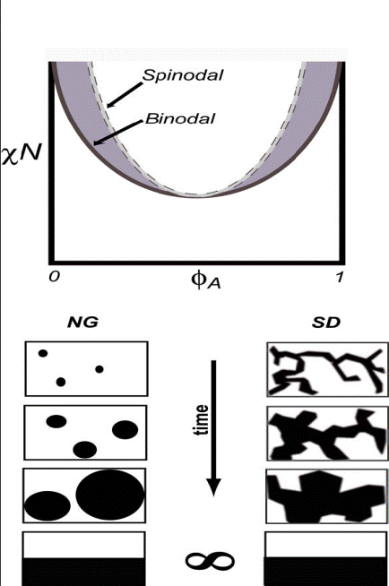 Рис. 7. Схема фазовой диаграммы симметричной смеси гомополимеров и формирования фазовой морфологии при разделении фаз в метастабильной области (зарождение, рост и слияние фаз) NG и в нестабильной области (спинодальный распад) SD