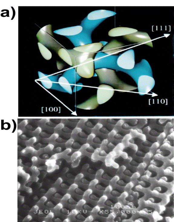 Направленное регулирование морфологии суперкристаллической структуры регулированием длины и природы блоков, а также совмещением блоксополимеров с различной длиной блоков, блоксополимеров с гомополимерами, диблоксополимера А-В с гетерофазной смесью гомополимеров А и В, триблоксопролимера АВС со сравнительно низкомолекулярным диблок сополимером ас и др. (Рис.6).
